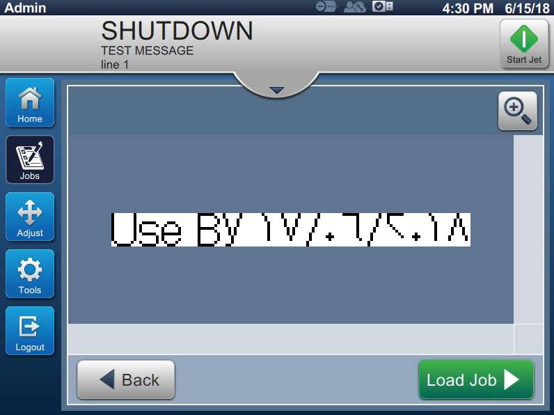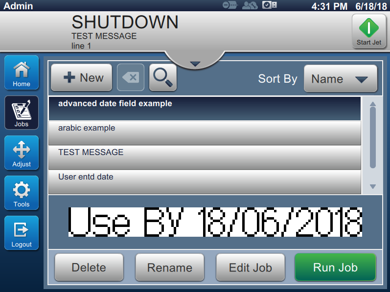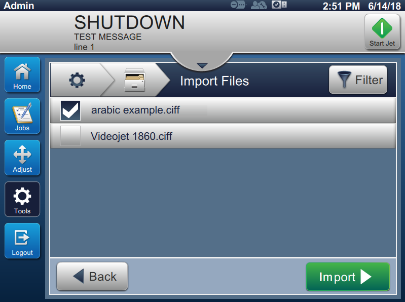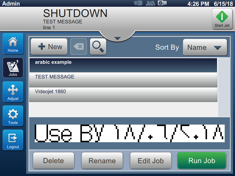 Save the job file to the application and click Back to return to home page. The job ‘arabic example’ date is added to the job list under Videojet 1860 and 12-high. |