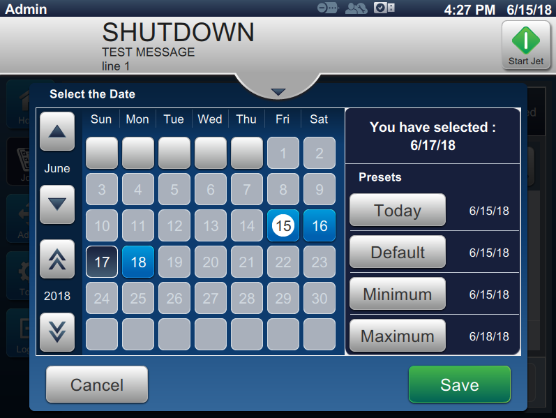 The calendar in the standard Gregorian format appears. Select the required date (17 in this example) and touch Save. |