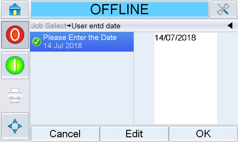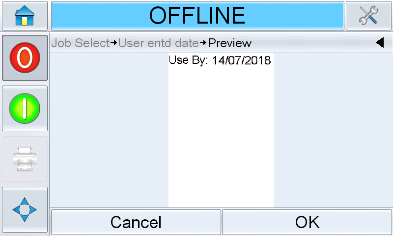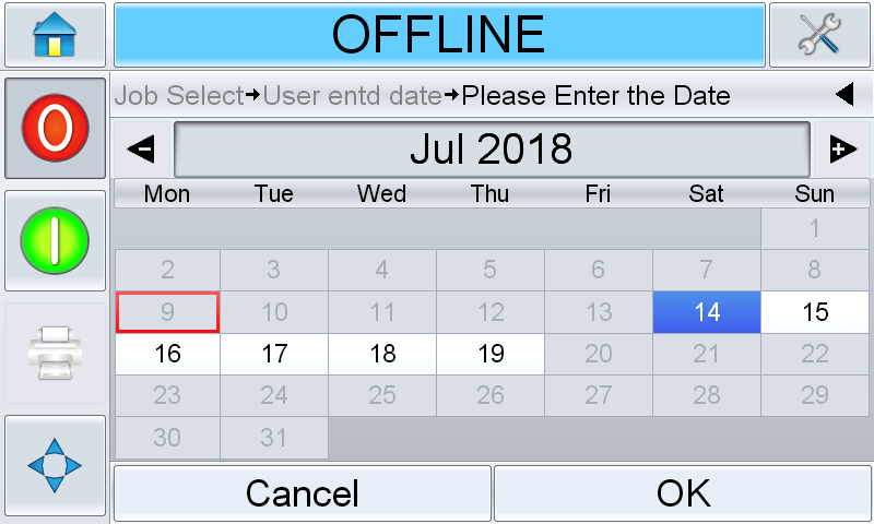 Select the required date (14 in this example) from the available dates by touching the required date. The dates between the minimum and maximum offset days are displayed in blue and are available for selection. All other dates are disabled and cannot therefore be incorrectly selected by the operator. The current printer date is shown in a white circle and the current selection in dark grey. Touch OK. |