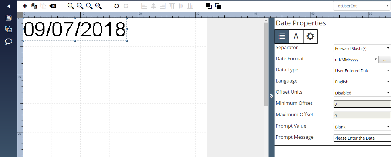 Select the minimum offset as ‘5’ and maximum offset as ‘10’. Design calculates the offset dates based on the printer date. The operator will only be able to select a date between these calculated offset dates. |