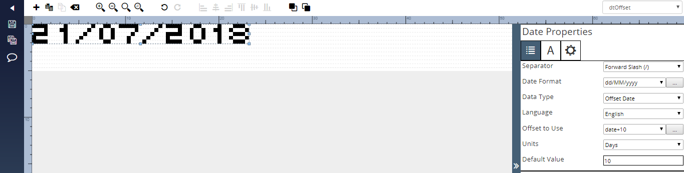 In this example, we will generate a date using a date offset. A date offset is calculated from an offset value, which can be a number of days, months or years. We will generate a date, or range of dates using a defined offset period from the base date, defined in Step 6 (printer date). |