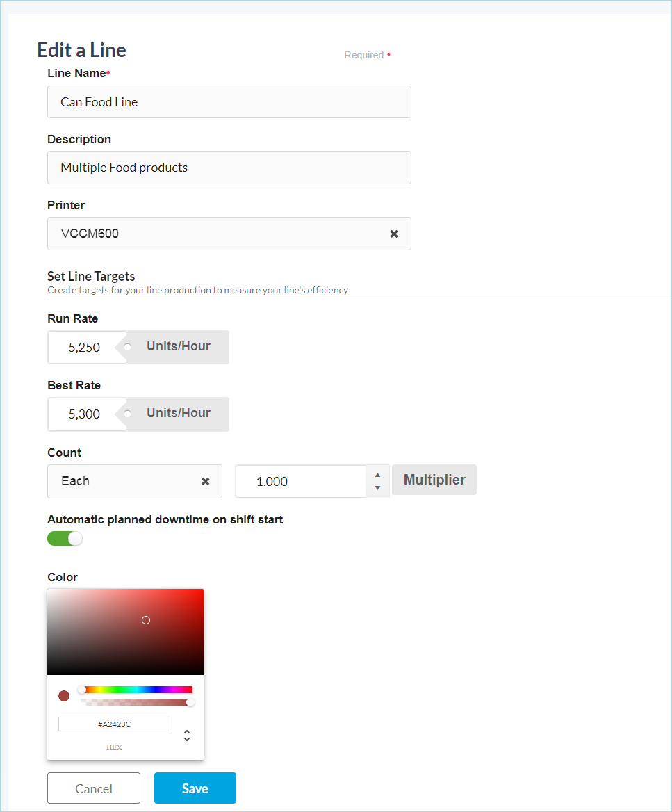 Printer: Select the printer that will be used to capture the count that will be used to create the OEE. All VRS connected printers that are already assigned to another line will be grayed out.