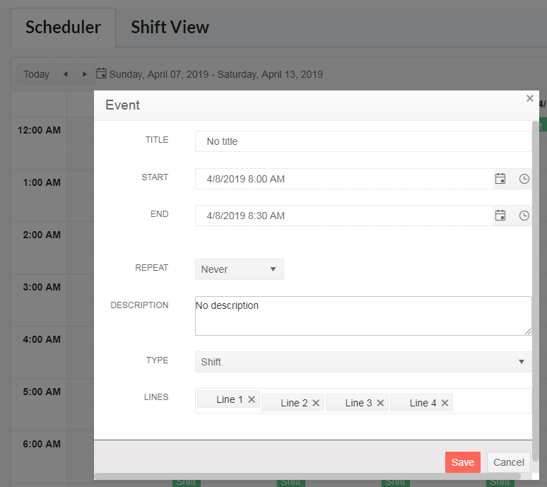 You can create events for Shifts, Scheduled Maintenance, or Breaks.